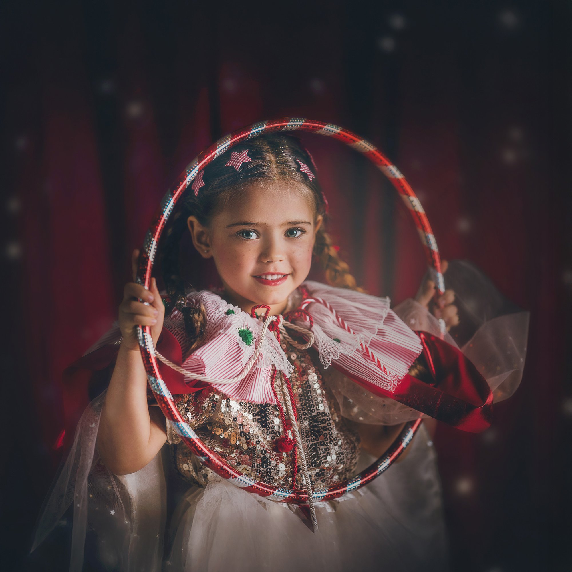 Sessão fotográfica infantil, realizada em estúdio, que cruza o imaginário natalício e a visão mágica Tales of Light.
